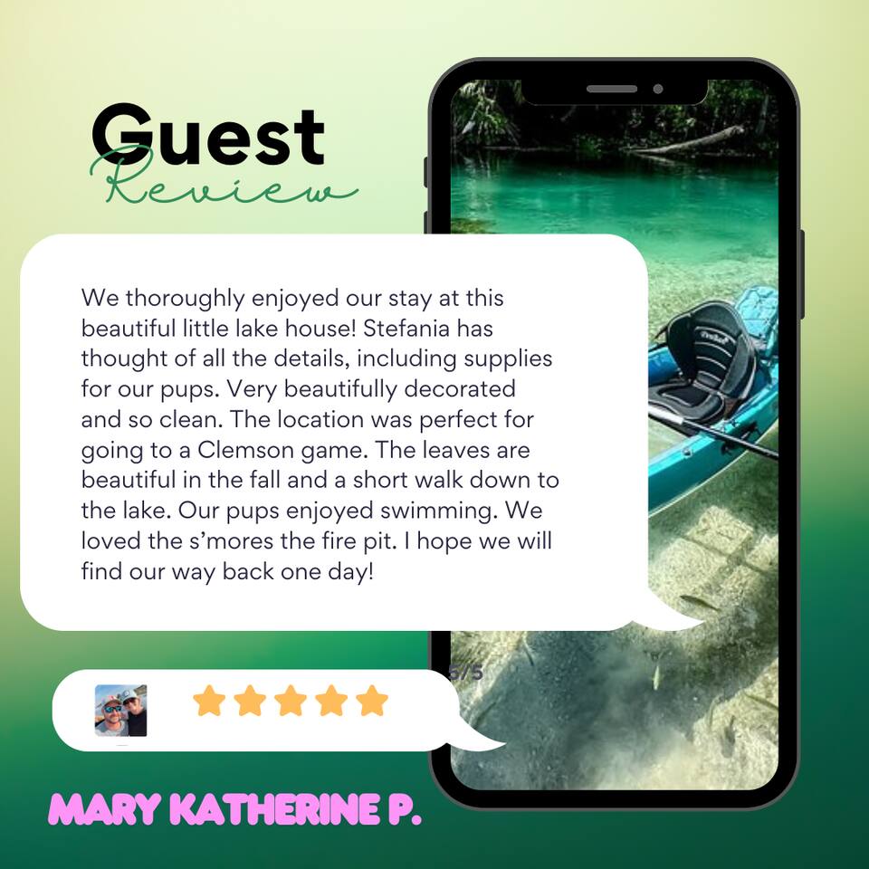 ◍ Lake access ◍ Walk to Portman Marina + Galley & Nami ◍ Near Clemson, Anderson, Big Water Marina, Green Pond Landing ◍ 3.4 mi to groceries & pharmacy ◍ Firepit | 2 Kayaks | 2 Paddle Boards | SC+GA park passes ◍ King bed | Blackout curtains ◍ YouTube TV | NBA League Pass | Paramount+ ◍ Chef’s kitchen: Pizza oven, Blackstone, Keurig, Nespresso, KitchenAid ◍ Baby + Pet gear included ◍ No checkout chores